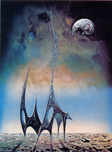 In queste immagini, forme dinamiche fluttuano in paesaggi ultraterreni e implicano un altro regno oltre la vista. I suoi dipinti hanno illustrato libri, tra cui l'immagine Cosmo."