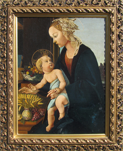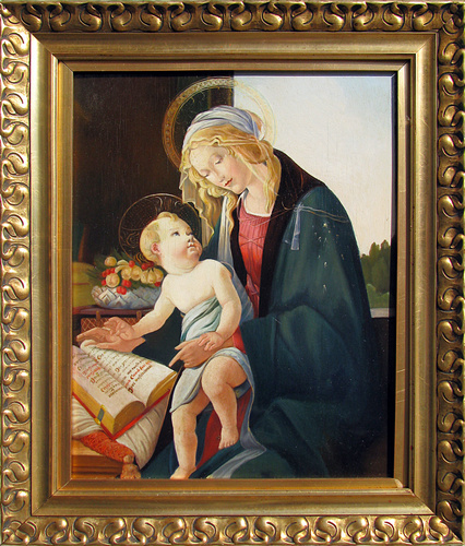 QUADRO DEL MAESTRO COPISTA DI FAMA MONDIALE RENATO ROSSI - OLIO SU TAVOLA 35 x 45 - COPIA DEL QUADRO DEL BOTTICELLI 'MADONNA DEL LIBRO' ESEGUITA NEL MUSEO 'POLDI PEZZOLI' A MILANO NEL 1897